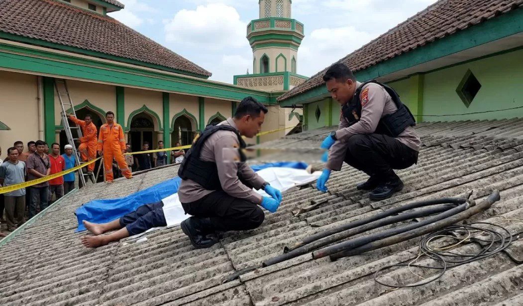 Lokasi mayat di atap masjid yang penuh kabel listrik memperkuat asumsi bahwa dua pria tewas tersebut terkena sengatan arus kuat.